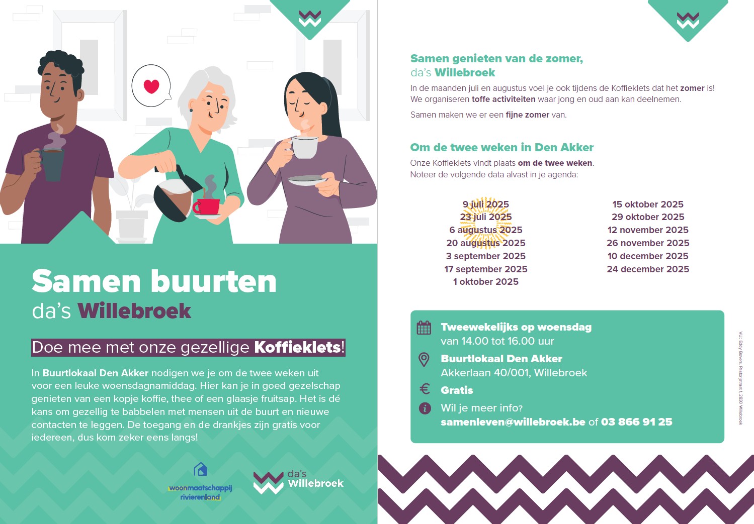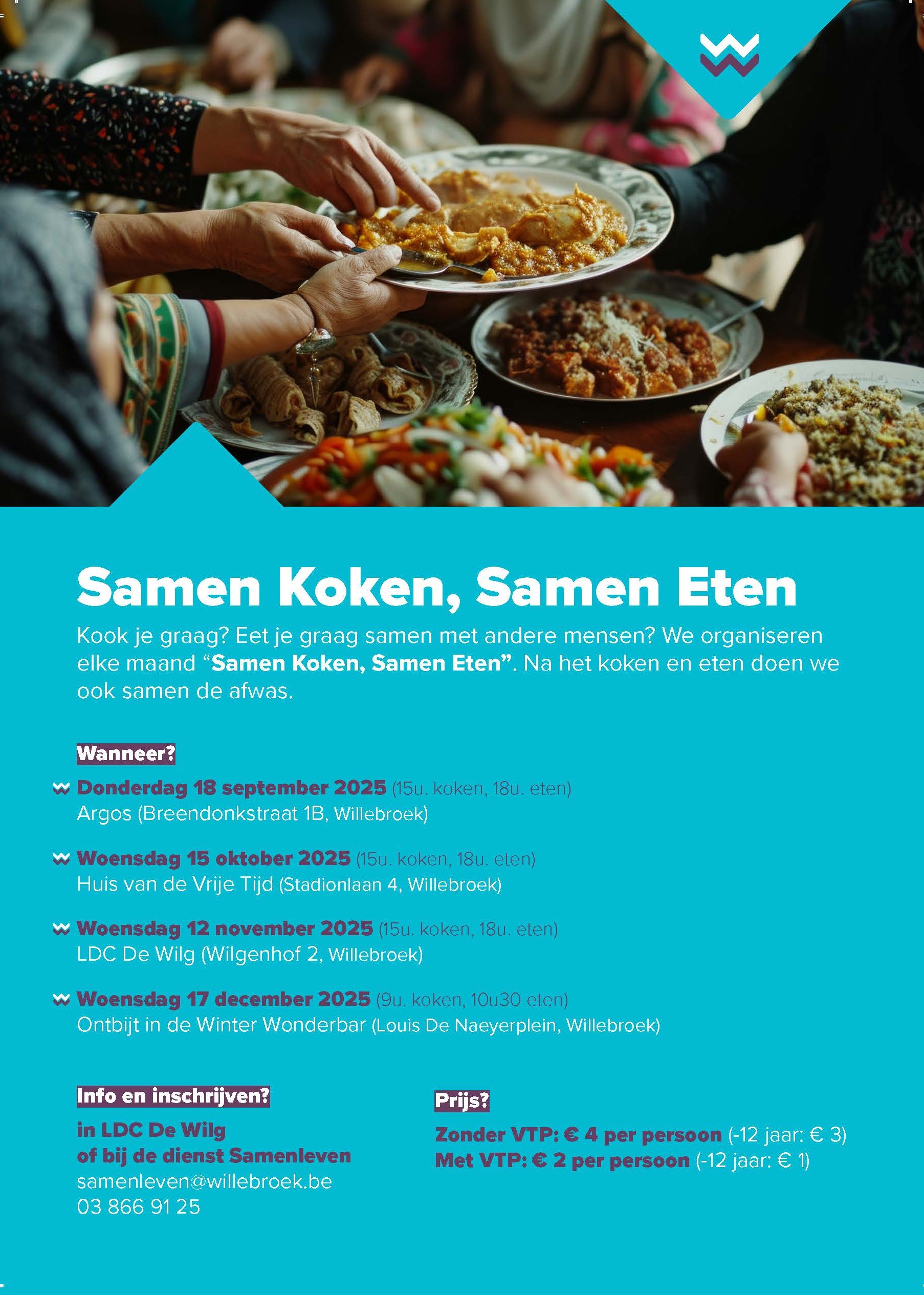 Neem contact op met dienst Samenleven voor meer informatie. Dit kan via het telefoonnummer 03 866 91 25 of via het mailadres samenleven@willebroek.be.