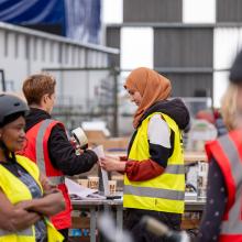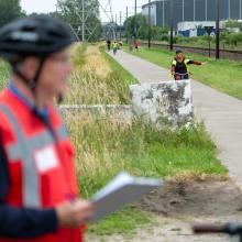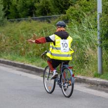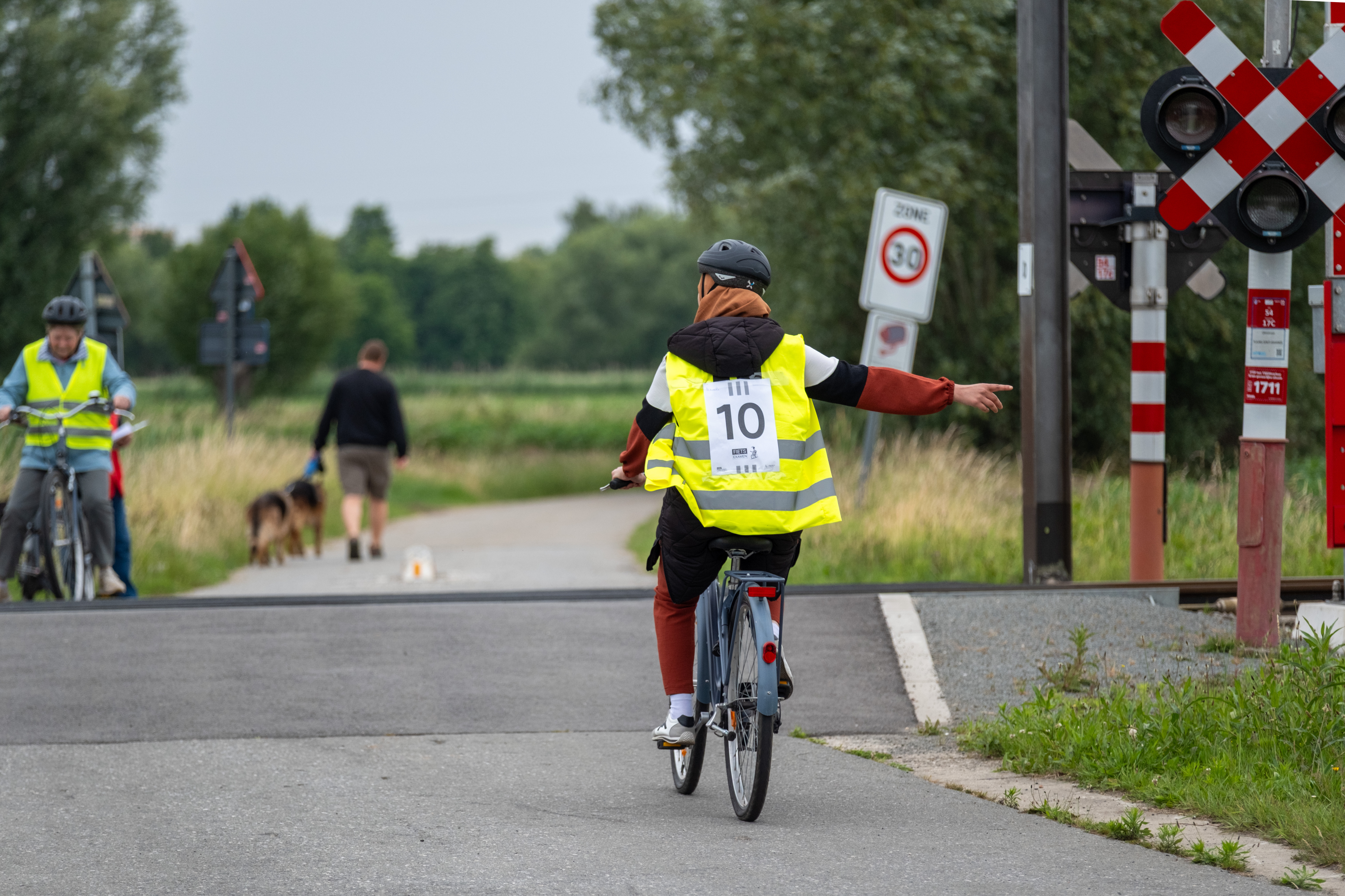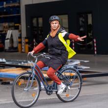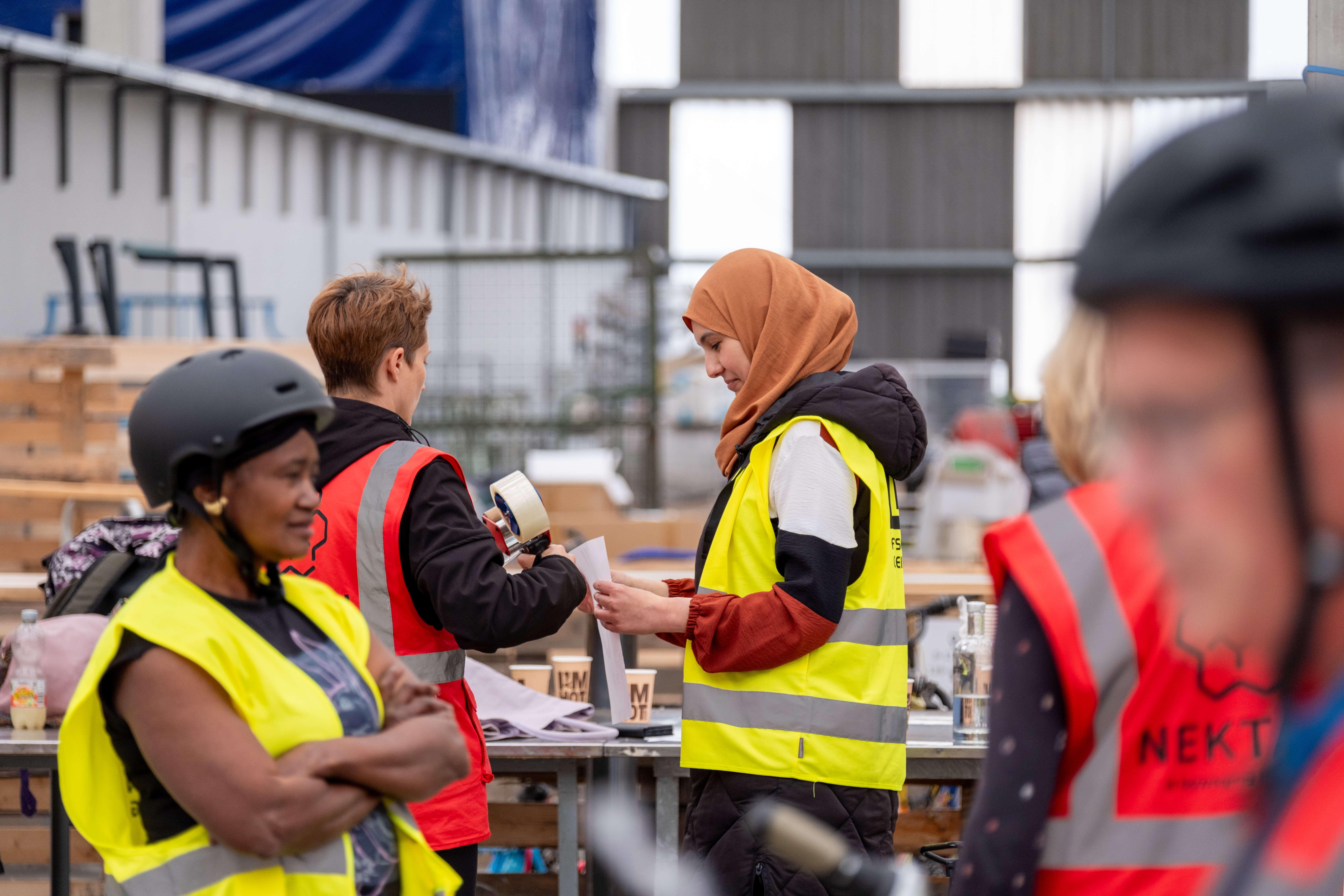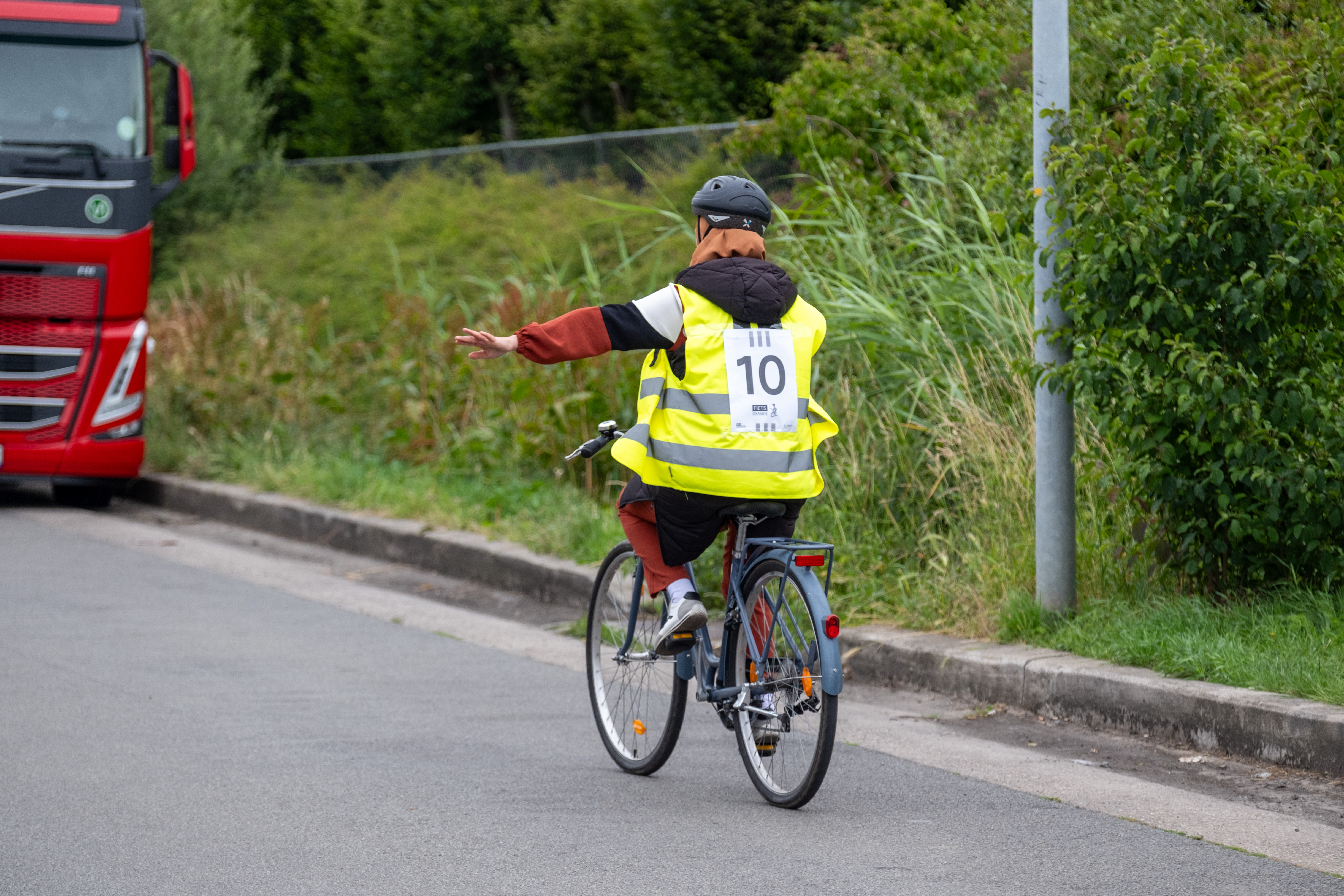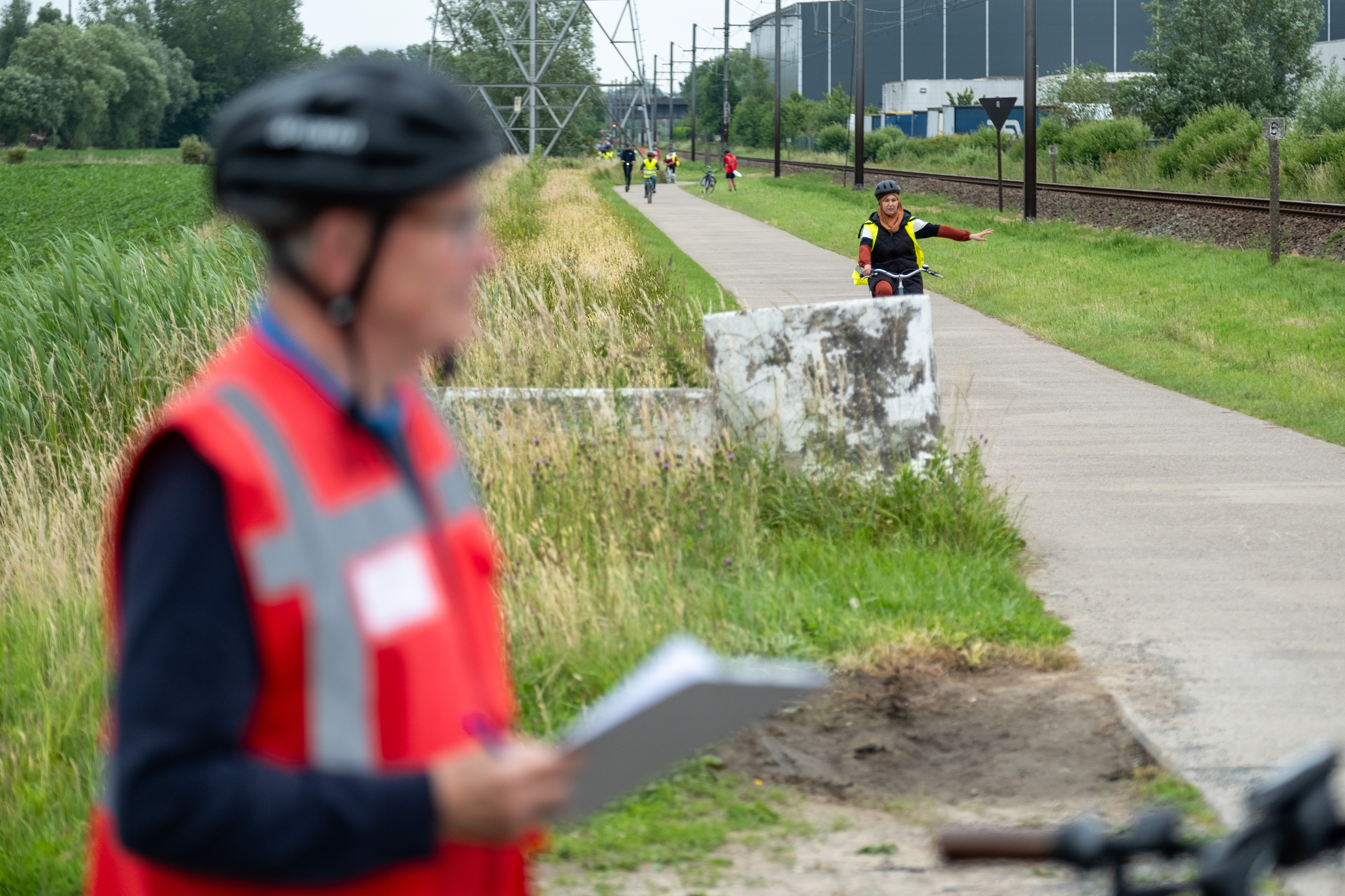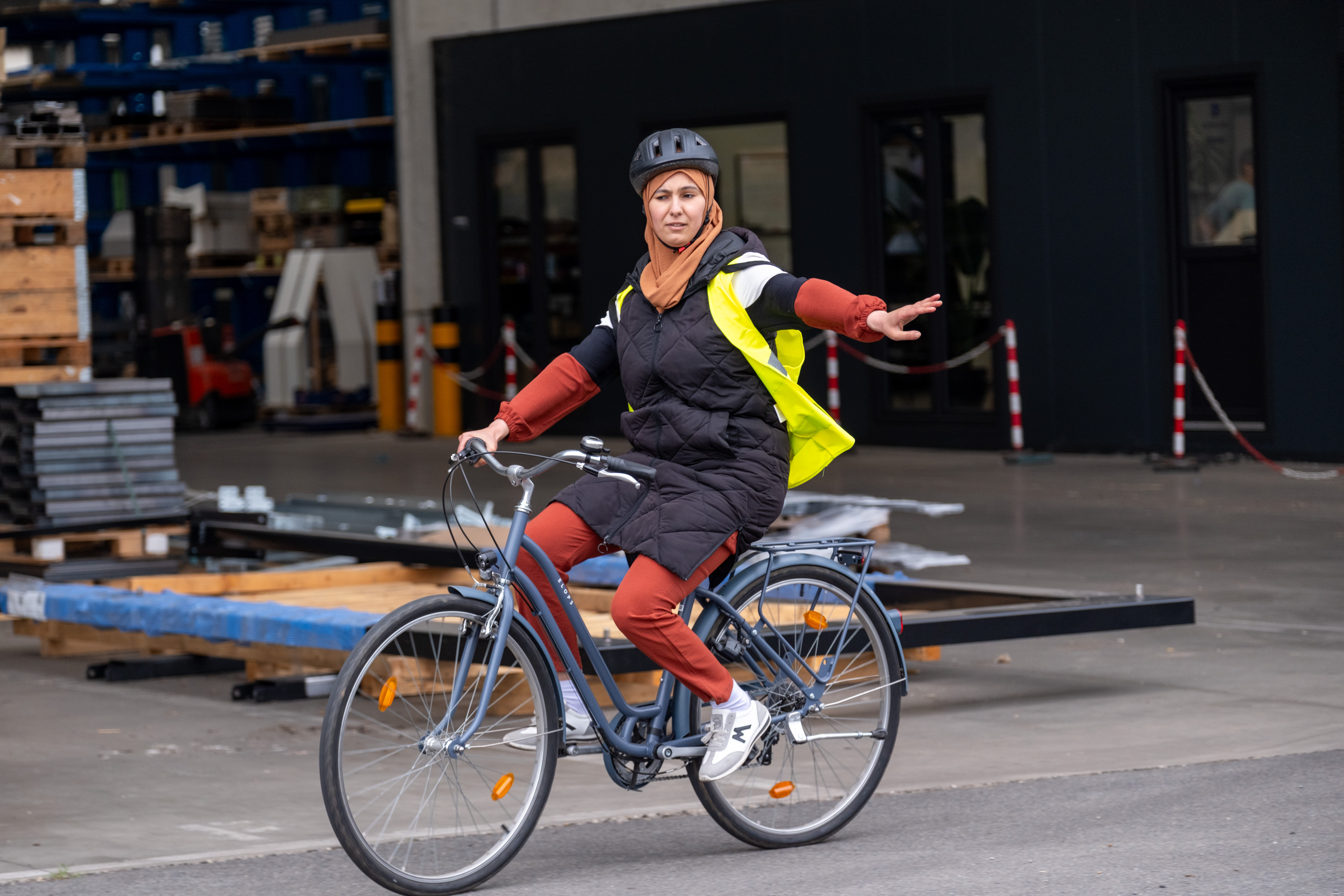Khaoula Ghailan bevestigt het nummer 10 op haar hesje, en is daarmee helemaal klaar om haar fietsexamen af te leggen. “Mijn twee kinderen kunnen fietsen, en ik loop de hele tijd te voet achter hen aan. Dat was ik stilaan écht beu”, lacht ze. “Ik ben afkomstig uit Marokko, en daar is fietsen vooral iets voor jongens. Maar hier fietst iedereen, dus wou ik het ook kunnen.”