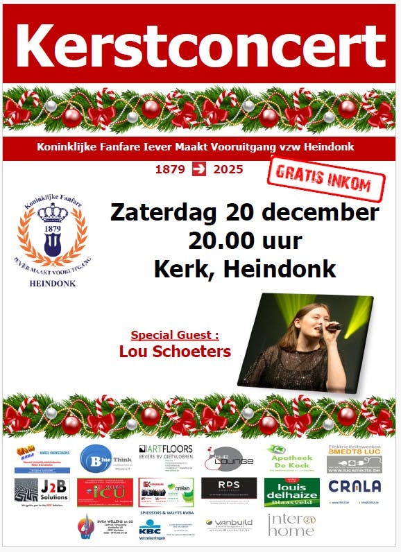 Jaarlijks Kerstconcert van de Koninklijke Fanfare Iever Maakt Vooruitgang uit Heindonk met als guest star dit jaar: Lou Schoeters. Wij dompelen u onder in een bad van kerstsfeer en muzikale klanken. Bovendien is de toegang gratis!