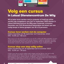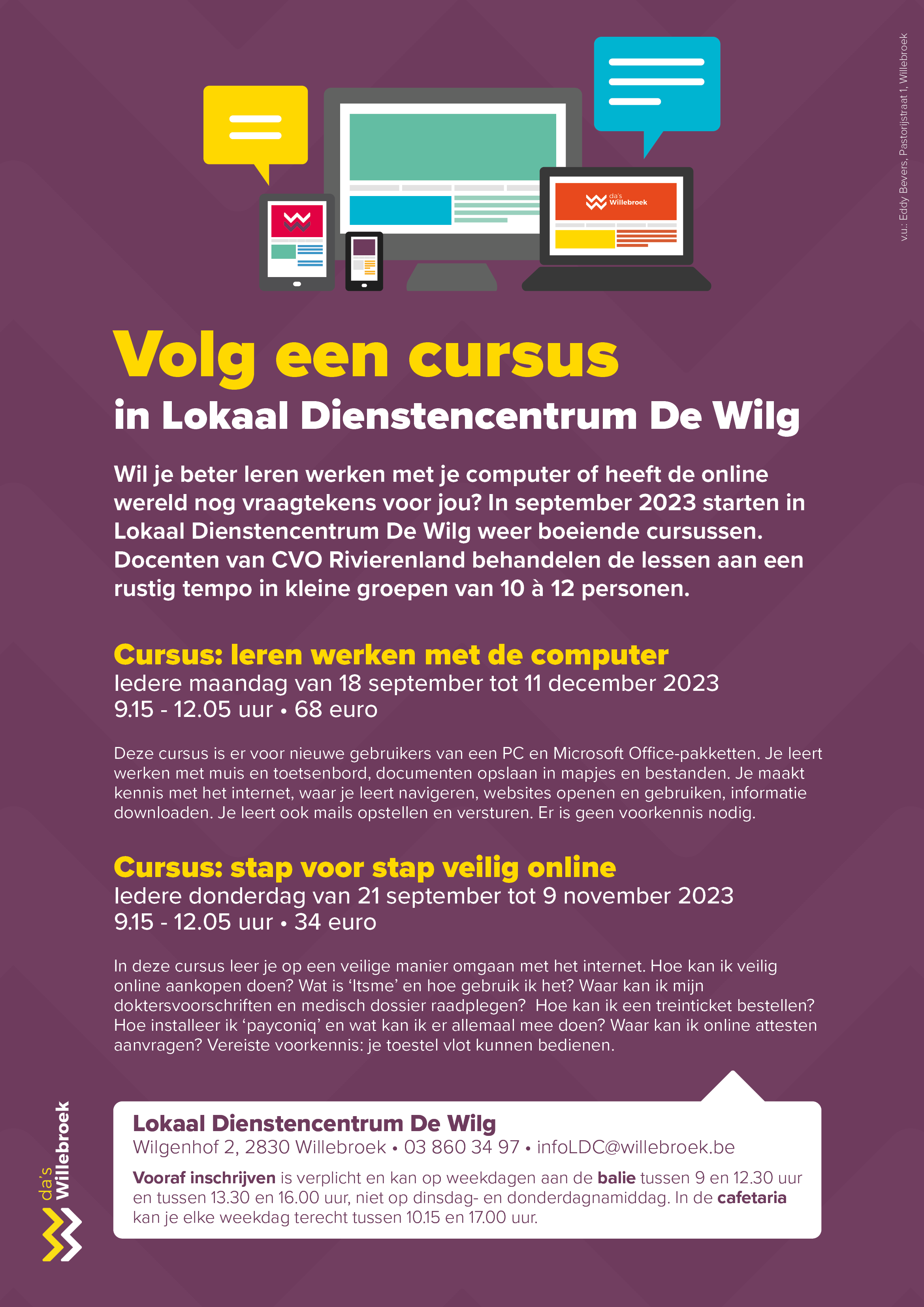 Wil je beter leren werken met je computer of heeft de online wereld nog vraagtekens voor jou? In september 2023 starten in Lokaal Dienstencentrum De Wilg weer twee boeiende cursussen. Er wordt gewerkt aan een rustig tempo in kleine groepen van zo’n 10 personen. De cursussen worden gegeven door docenten van CVO Rivierenland.